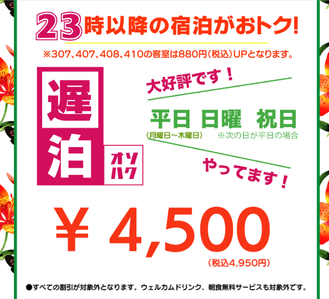 | ご利用日 | 【月曜日〜木曜日】 ¥4,500(税込¥4,950) PM11:00〜AM12:00 【金曜日・祝前日】 ¥6,300(税込¥6,930) PM11:00〜AM11:00 【土曜日】 ¥9,000(税込¥9,900) PM11:00〜AM11:00 【日曜日・祝日】 ¥4,500(税込¥4,950) PM11:00〜AM12:00 ※23時をすぎての宿泊が対象となります。 ※チェックアウトの時間を過ぎますと延長料金が30分毎に950円(税込み1,045円)加算されます。 ※祝日は、翌日が平日の場合になります。 |